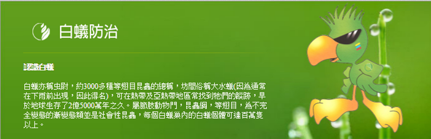 2.白蟻的食物源為環境中與木頭及纖維有關係的物品,如:裝潢、樹酯…等